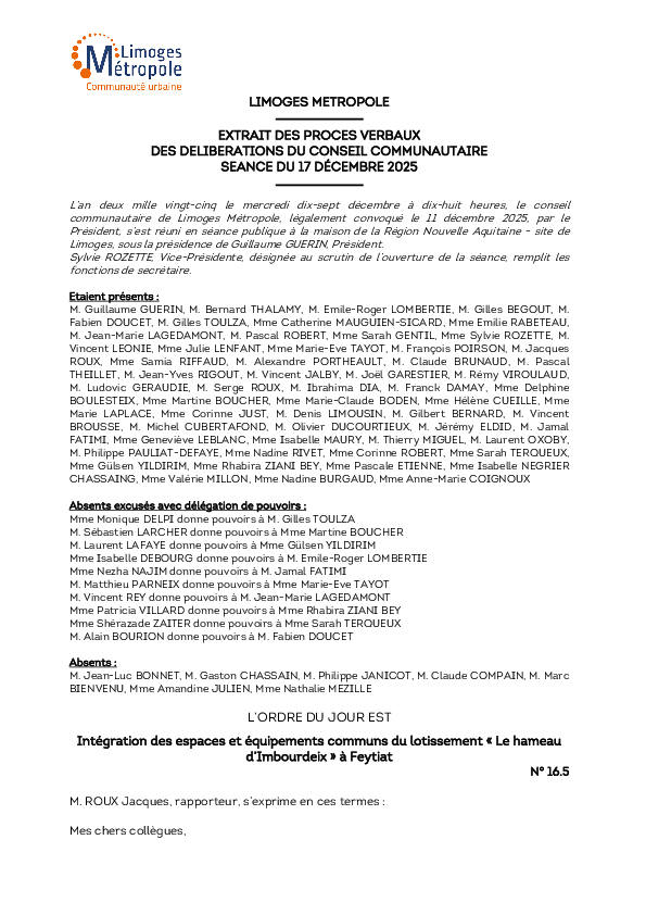 DélibérationIntégration des espaces et équipements communs du lotissement « Le hameau d’Imbourdeix » à Feytiat1 documentPublié le 24 Décembre 2025 Délibération du 17 décembre 2025 16_5.pdf (.pdf, 211,2 Ko) Télécharger PrécédentRetour à la listeSuivant