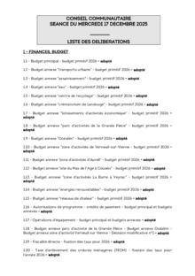 Liste des délibérationsListe des délibérations du conseil communautaire du 17 décembre 20251 documentPublié le 24 Décembre 2025 Liste_des_délibérations_17.12.2025.pdf (.pdf, 89,7 Ko) Télécharger PrécédentRetour à la listeSuivant