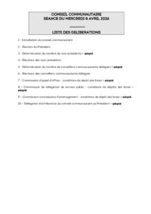 Liste des délibérationsListe des délibérations du conseil communautaire du 8 avril 20261 documentPublié le 9 Avril 2026 Liste_des_délibérations_08042026.pdf (.pdf, 54,2 Ko) Télécharger Retour à la listeSuivant