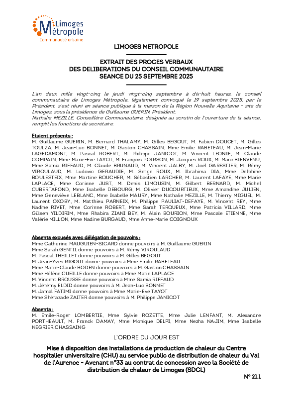 DélibérationMise à disposition des installations de production de chaleur du Centre hospitalier universitaire (CHU) au service public de distribution de chaleur du Val de l’Aurence - Avenant n°33 au contrat de concession avec la SDCL1 documentPublié le 3 Octobre 2025 Délibération 21.1.pdf (.pdf, 217,6 Ko) Télécharger PrécédentRetour à la listeSuivant