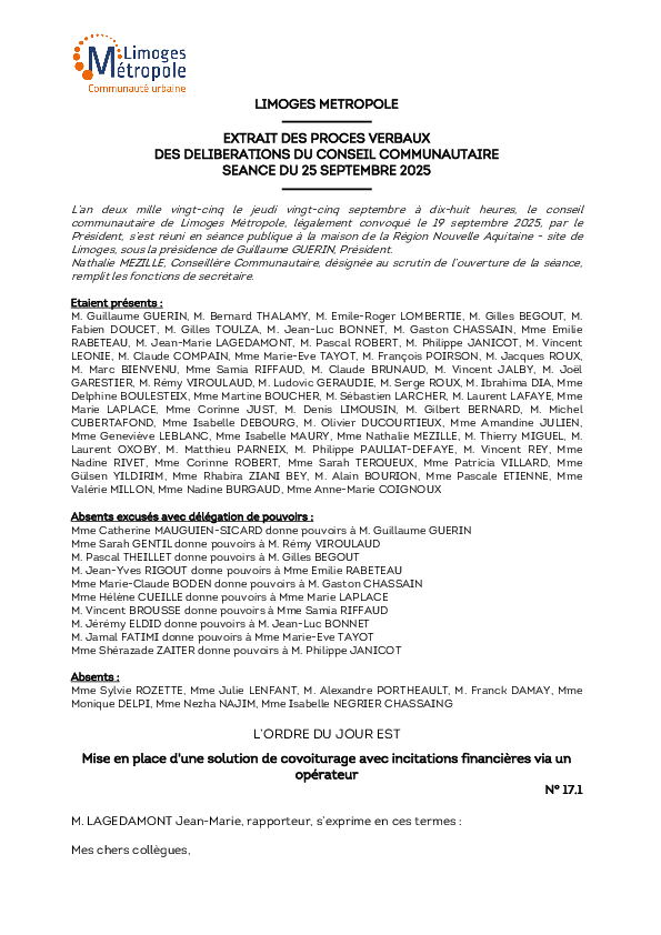 DélibérationMise en place d'une solution de covoiturage avec incitations financières via un opérateur1 documentPublié le 3 Octobre 2025 Délibération du 25 septembre 2025 17_1.pdf (.pdf, 231,7 Ko) Télécharger PrécédentRetour à la listeSuivant