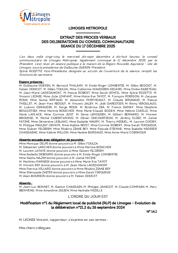 DélibérationModification n°1 du Règlement local de publicité (RLP) de Limoges – Evolution de la délibération n°21.2 du 26 septembre 20241 documentPublié le 23 Décembre 2025 Délibération du 17 décembre 2025 14_1.pdf (.pdf, 210,5 Ko) Télécharger PrécédentRetour à la listeSuivant