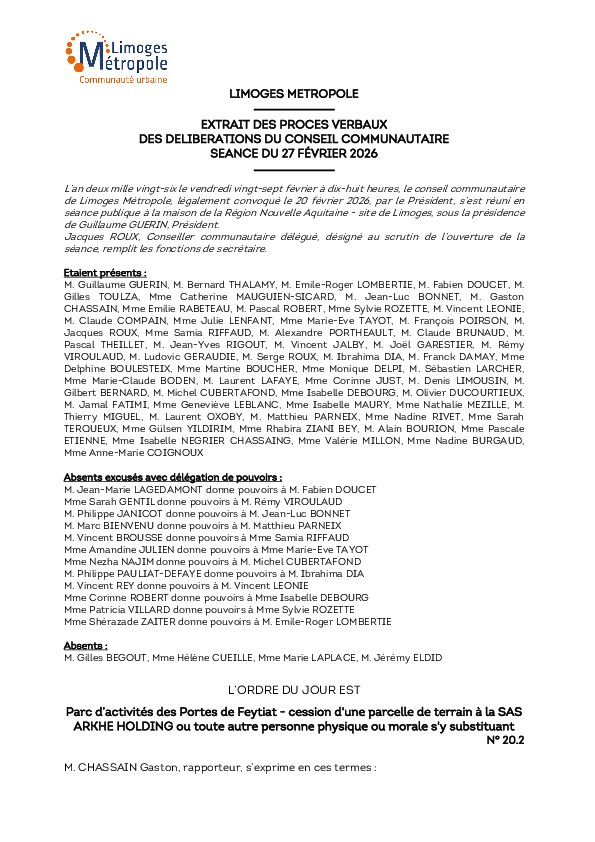 DélibérationParc d’activités des Portes de Feytiat - cession d'une parcelle de terrain à la SAS ARKHE HOLDING ou toute autre personne physique ou morale s'y substituant1 documentPublié le 5 Mars 2026 Délibération du 27 février 2026 20_2.pdf (.pdf, 1,4 Mo) Télécharger PrécédentRetour à la listeSuivant