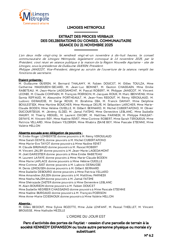 DélibérationParc d’activités des portes de Feytiat - cession d'une parcelle de terrain à la société KENNEDY EXPANSION ou toute autre personne physique ou morale s'y substituant1 documentPublié le 4 Décembre 2025 Délibération du 21 novembre 2025 6_2.pdf (.pdf, 1,2 Mo) Télécharger PrécédentRetour à la listeSuivant