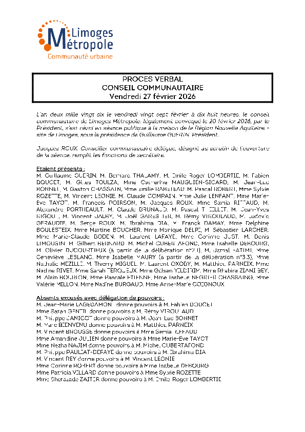 Procès verbalProcès-verbal du conseil communautaire du 27 février 2026 1 documentPublié le 15 Avril 2026 PV_CC_27022026_VF.pdf (.pdf, 7,0 Mo) Télécharger Retour à la listeSuivant