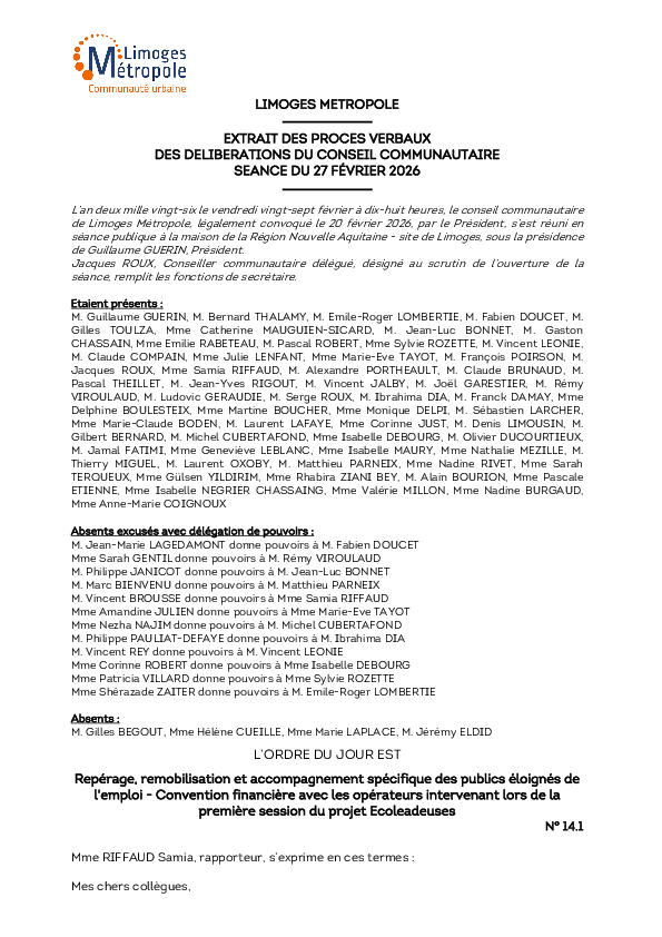 DélibérationRepérage, remobilisation et accompagnement spécifique des publics éloignés de l'emploi - Convention financière avec les opérateurs intervenant lors de la première session du projet Ecoleadeuses1 documentPublié le 5 Mars 2026 Délibération du 27 février 2026 14_1.pdf (.pdf, 948,7 Ko) Télécharger PrécédentRetour à la listeSuivant