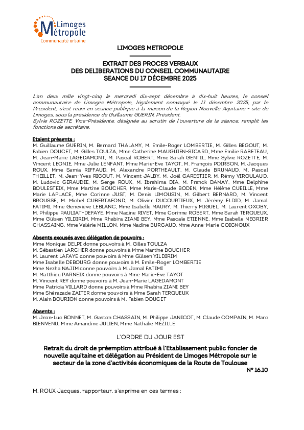 DélibérationRetrait du droit de préemption attribué à l’Etablissement public foncier de nouvelle aquitaine et délégation au Président de Limoges Métropole sur le secteur de la zone d’activités économiques de la Route de Toulouse1 documentPublié le 24 Décembre 2025 Délibération du 17 décembre 2025 16_10.pdf (.pdf, 209,6 Ko) Télécharger PrécédentRetour à la listeSuivant