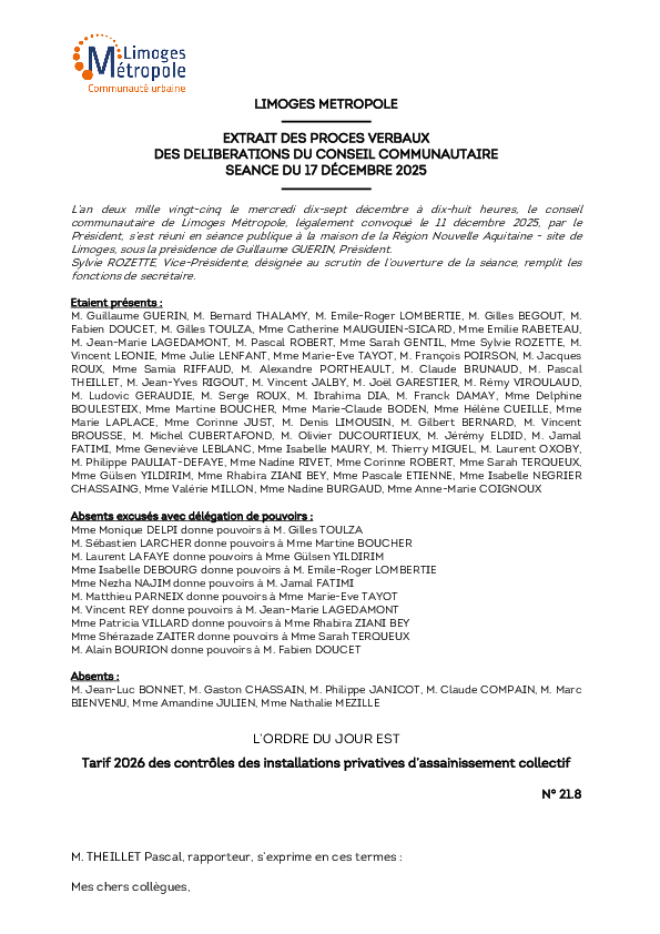 DélibérationTarif 2026 des contrôles des installations privatives d’assainissement collectif1 documentPublié le 23 Décembre 2025 Délibération du 17 décembre 2025 21_8.pdf (.pdf, 225,9 Ko) Télécharger PrécédentRetour à la listeSuivant