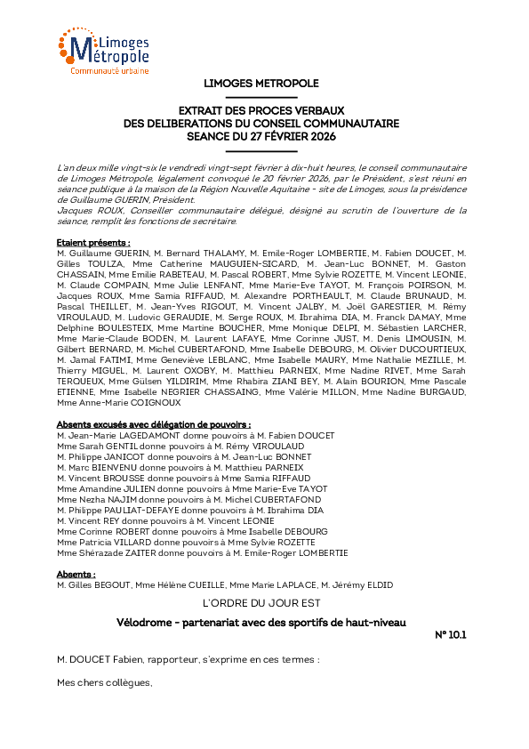 DélibérationVélodrome - partenariat avec des sportifs de haut-niveau1 documentPublié le 6 Mars 2026 Délibération du 27 février 2026 10_1.pdf (.pdf, 211,5 Ko) Télécharger PrécédentRetour à la listeSuivant