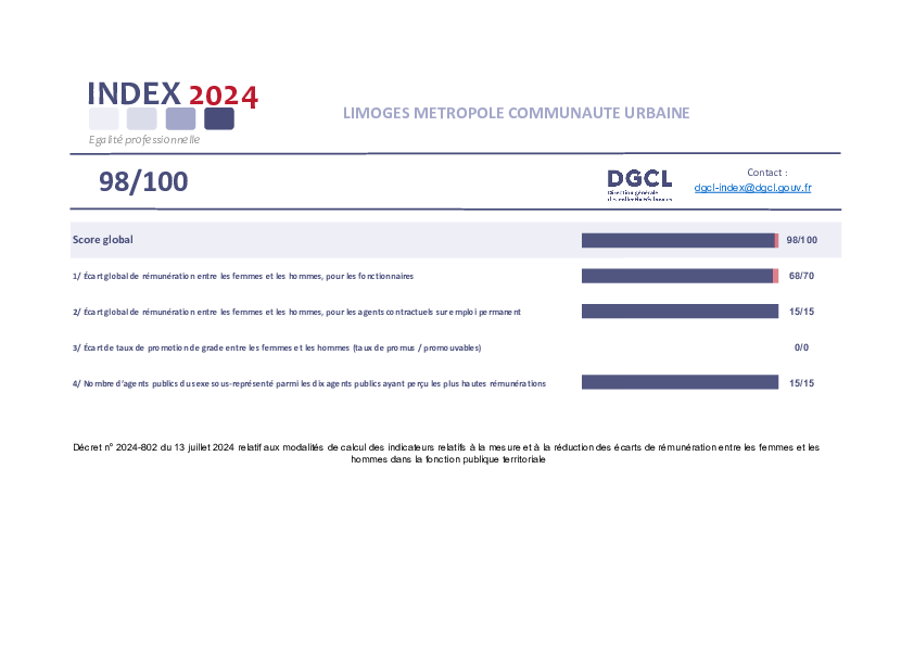 Limoges MétropoleIndex égalité professionnelle 2024 de Limoges Métropole1 documentPublié le 20 Novembre 2025 Index égalité rémunération hommes femmes Limoges Métropole (.pdf, 214,6 Ko) Télécharger PrécédentRetour à la listeSuivant