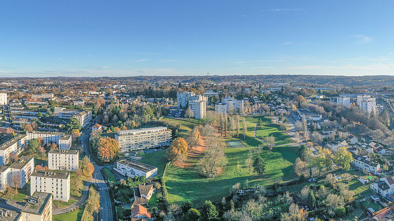 Un écoquartier structuré autour d’un parc urbain, pleinement intégré au centre-ville et au parc des bords de Vienne.